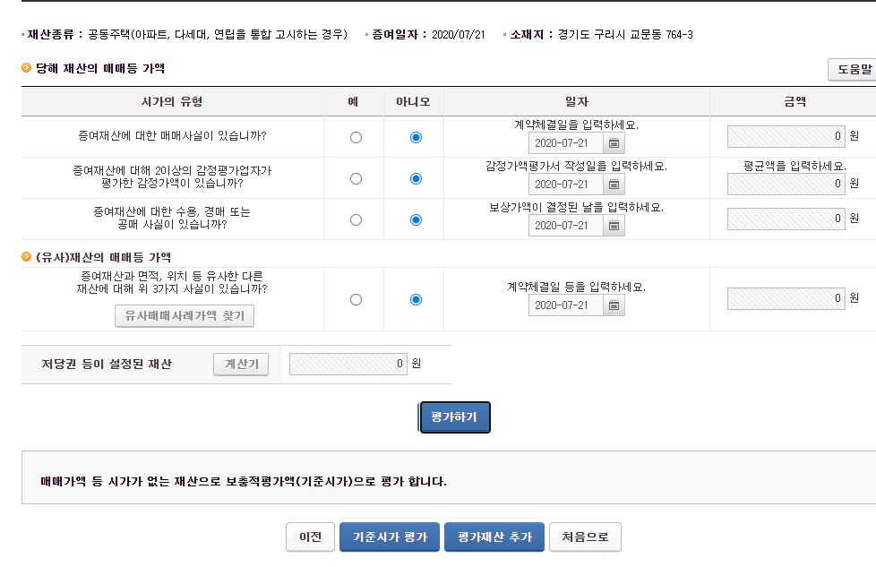 국세청 들어가서 증여재산 평가하기로 해본거 첨부해드립니다.